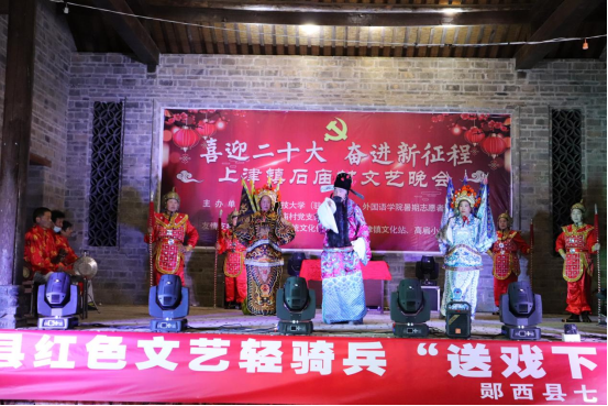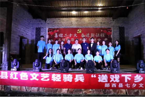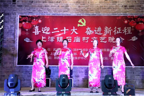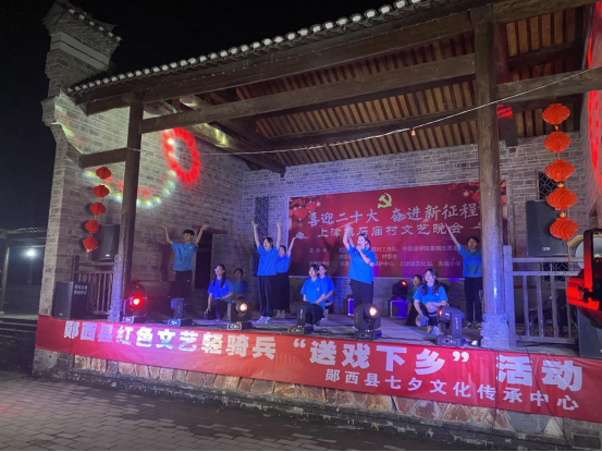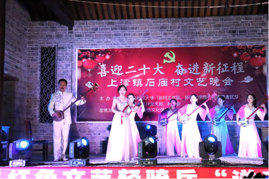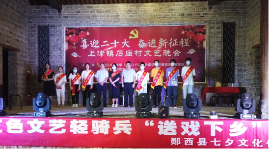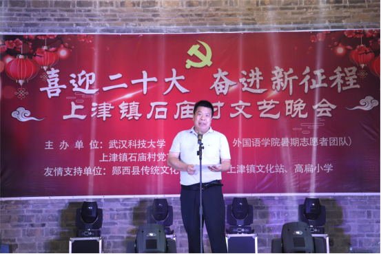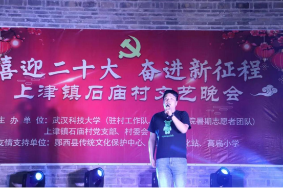 武科大网讯(通讯员张桐菲 丁虹)7月28日晚,上津镇石庙村文体广场张灯结彩、喜气洋洋,由威尼斯官网驻村工作队、外国语学院“梦载星河”暑期社会实践团队和上津镇石庙村党支部、村委会联合举办的“喜迎二十大,奋进新征程”文艺晚会激情上演。“国宝”郧西三弦、非物质文化遗产上津山二黄、大学生劲舞、村民们广场舞、童音朗诵等节目给近八百村民带来一场视觉宴会。