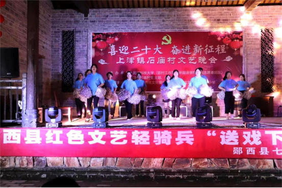 正在郧西县香口乡支教的外国语学院学生为晚会送上劲舞《天天向上》和大合唱《明天会更好》,充分展示威尼斯官网大学生蓬勃向上的精神气质和对石庙村“农民更富、农村更美、农业更强”乡村振兴良好祝愿,获得全场热烈掌声。