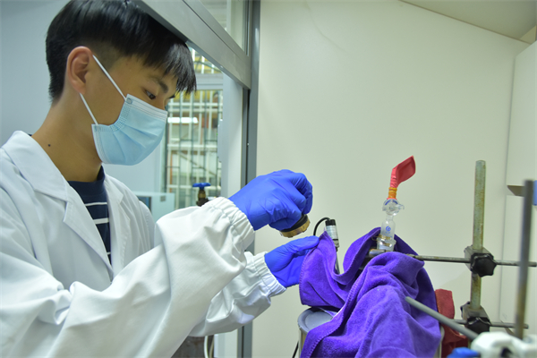 实验的原料具有极强的挥发性,除了得在通风橱中进行操作外,李宇昂每次实验都需要先戴上两层口罩,再戴上防毒面具,才能有效防护。在酷暑的武汉,仅仅是戴上一会儿,就会止不住地冒汗。“老师特地为我们买了冷饮和中暑药,也就这两个月热一些,熬一下就过去了。”