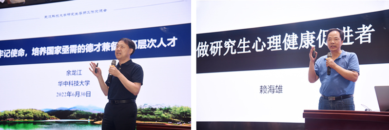 华中科技大学余龙江教授、武汉大学原心理健康教育中心主任赖海雄分别作了题为“牢记使命,培养国家亟需的德才兼备的高层次人才”“做研究生心理健康促进者”的讲座。