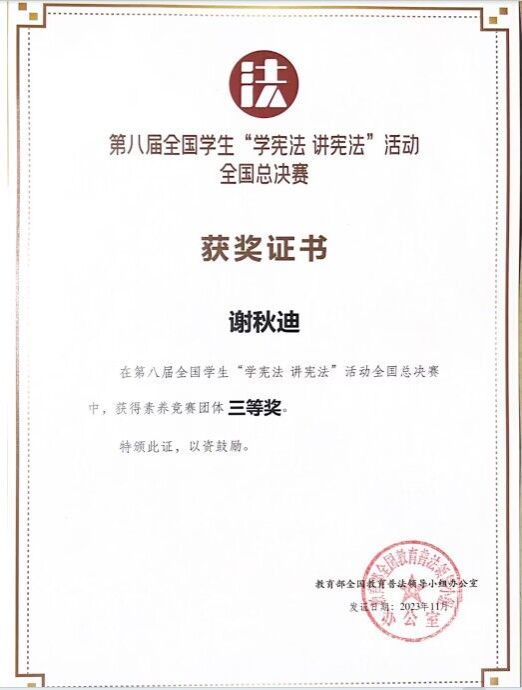 经过学校推荐,湖北省初赛、决赛层层比拼,谢秋迪一路过关斩将,获得湖北省第八届“学宪法 讲宪法”比赛高校组素养竞赛第一名,作为湖北省代表队唯一高校学生代表参加全国总决赛。